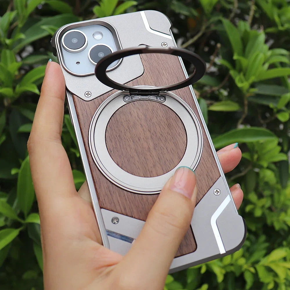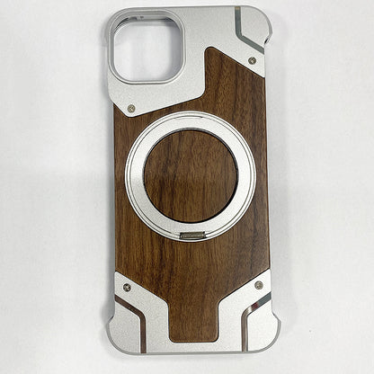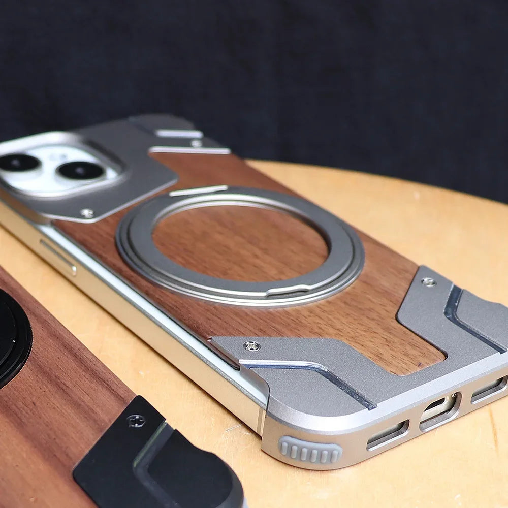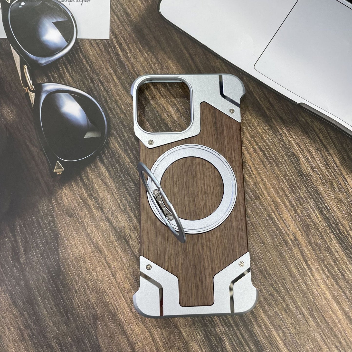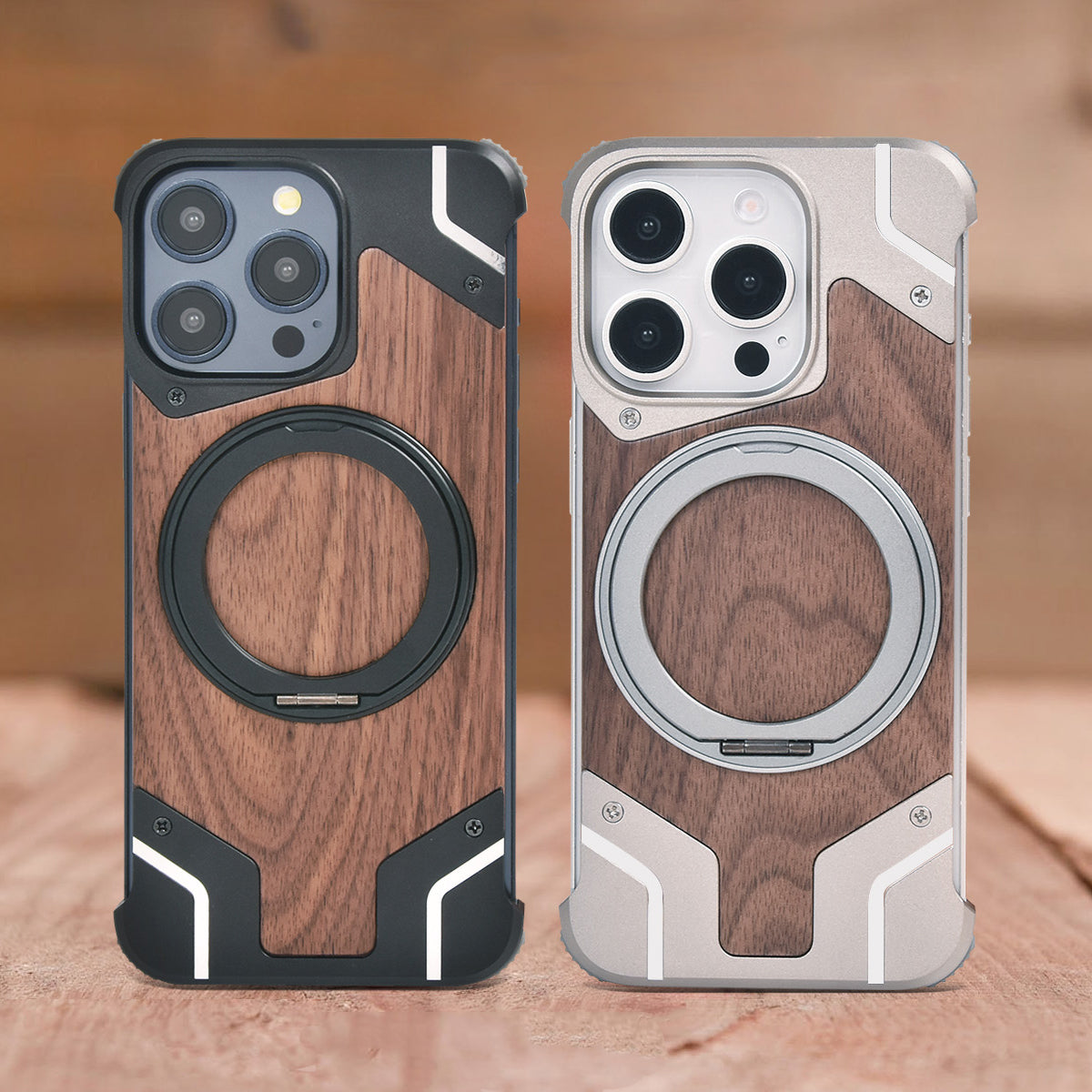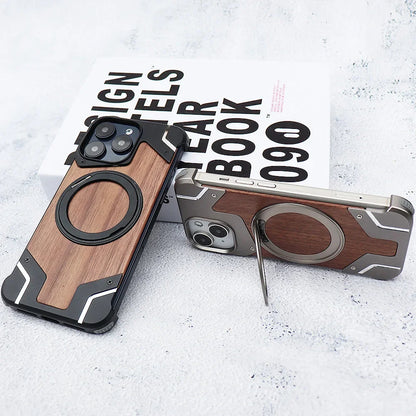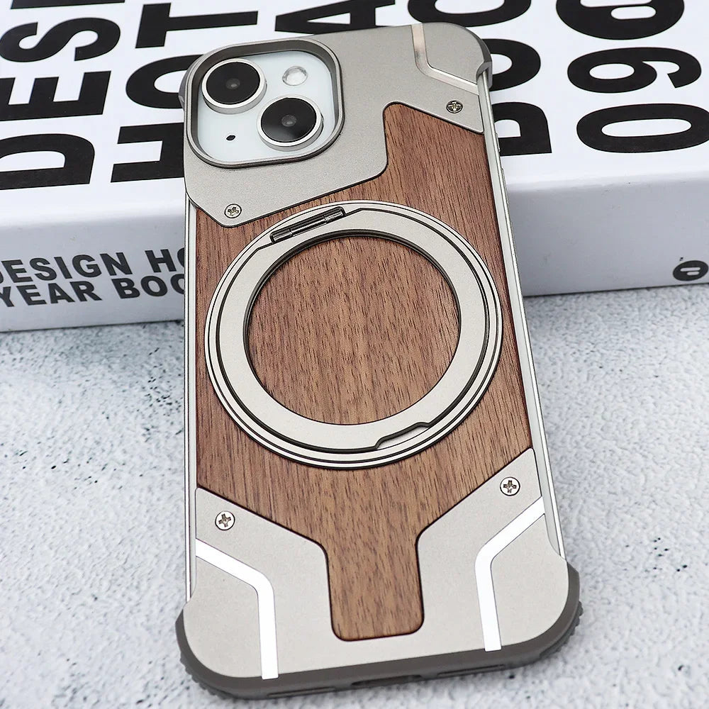 Armor King Bezel-less Armature MagSafe Pivot Ring Stand Metal + Walnut Wood Case Cover