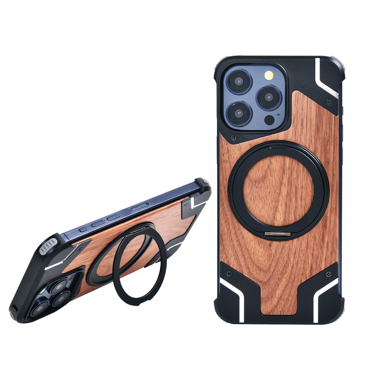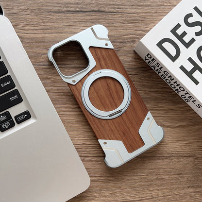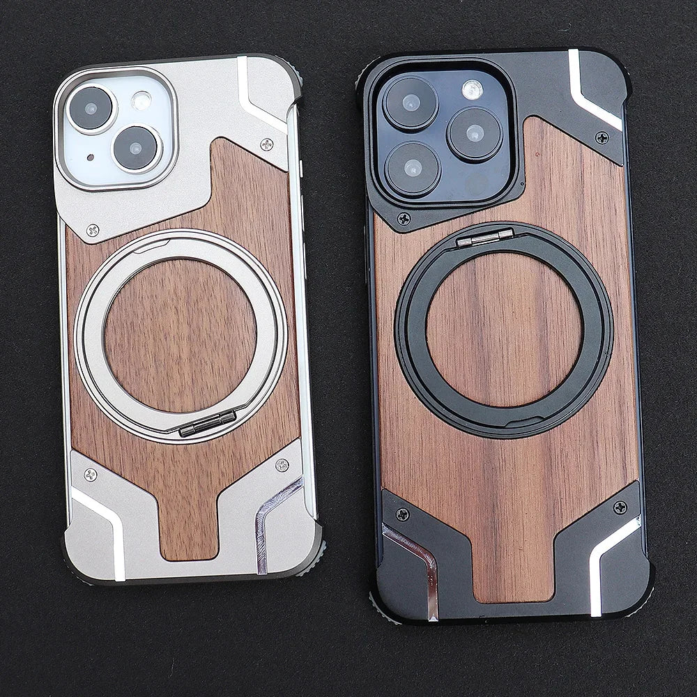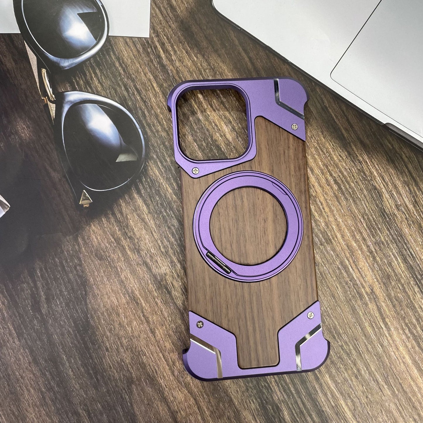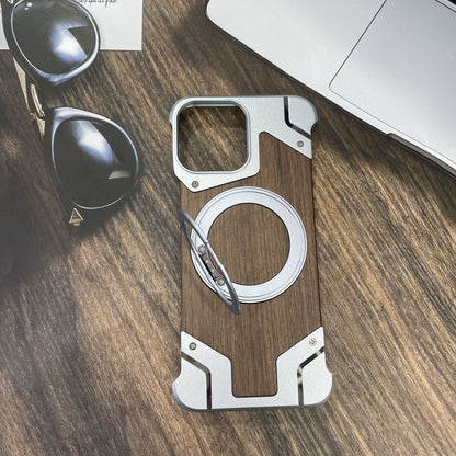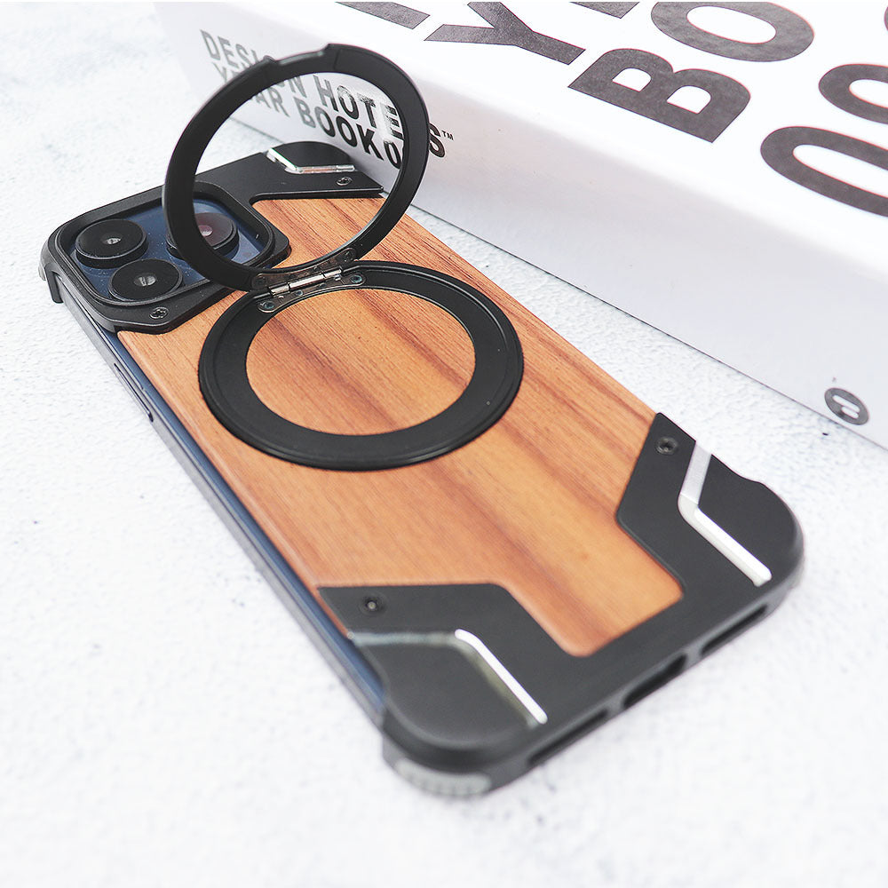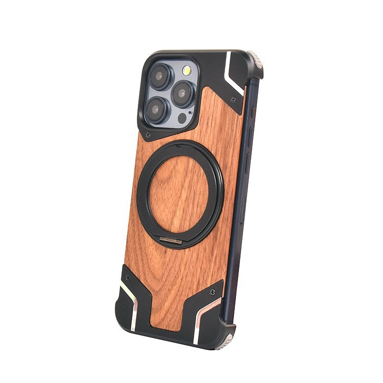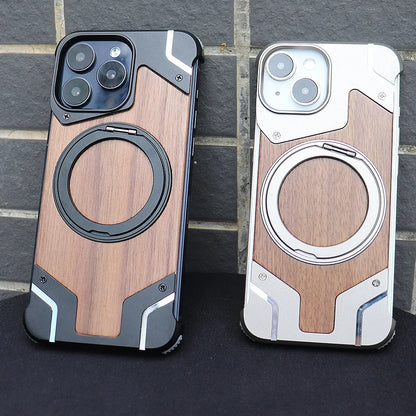 Armor King Bezel-less Armature MagSafe Pivot Ring Stand Metal + Walnut Wood Case Cover