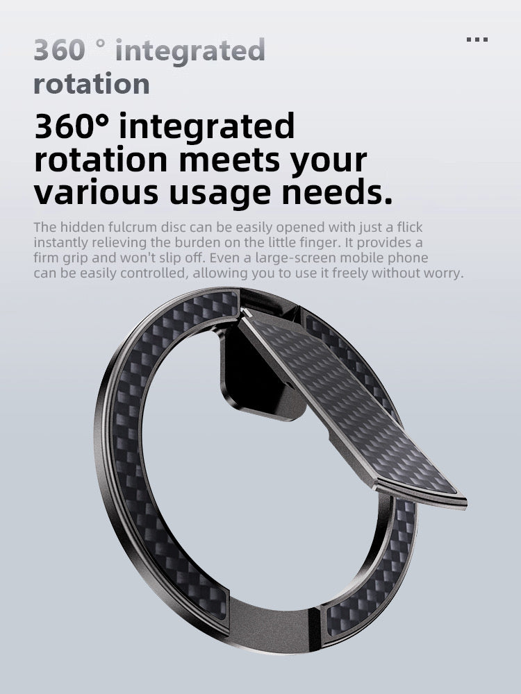 360° integrated rotation meets your various usage needs. The hidden fulcrum disc can be easily opened with just a flick instantly relieving the burden on the little finger. lt provides a firm grip and won't slip off. Even a large-screen mobile phone can be easily controlled, allowing you to use it freely without worry.