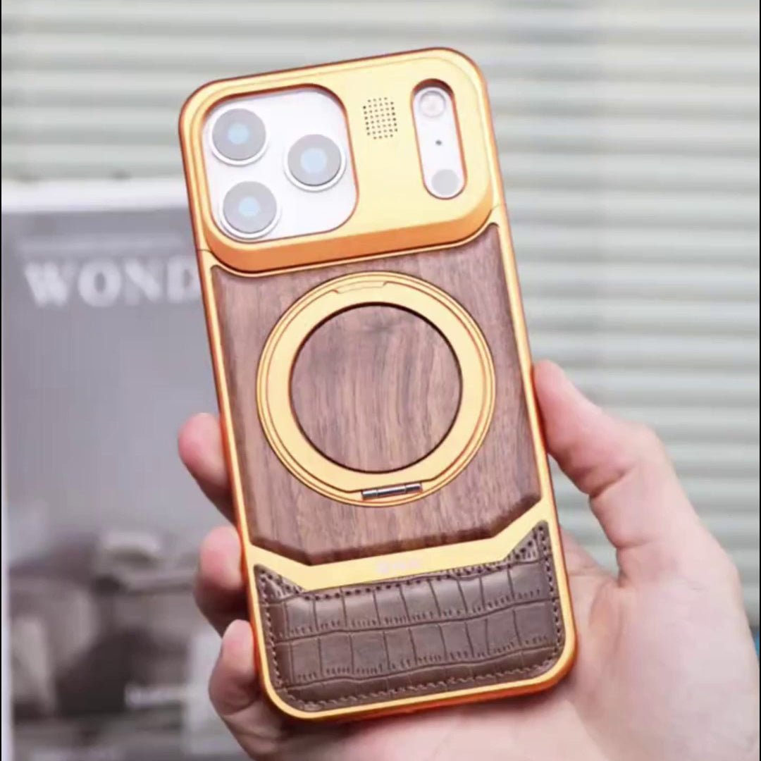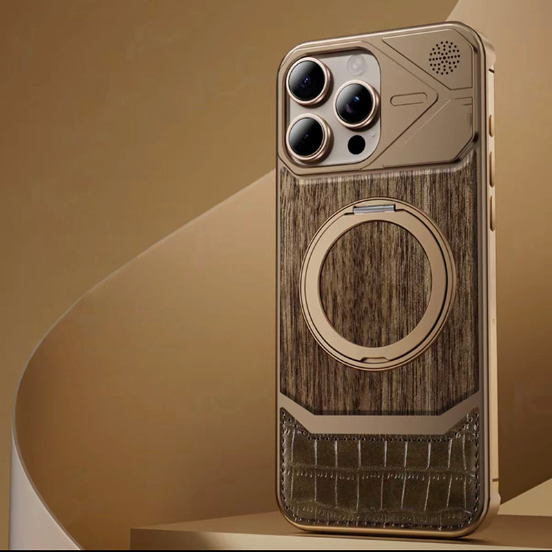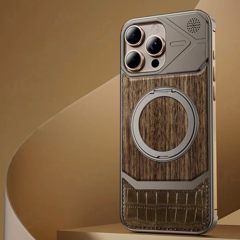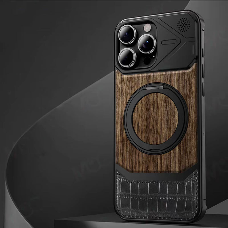 Armor King MagSafe Pivot Ring Stand Walnut + Leather + Aluminum Heat Dissipation Aromatherapy Case Cover