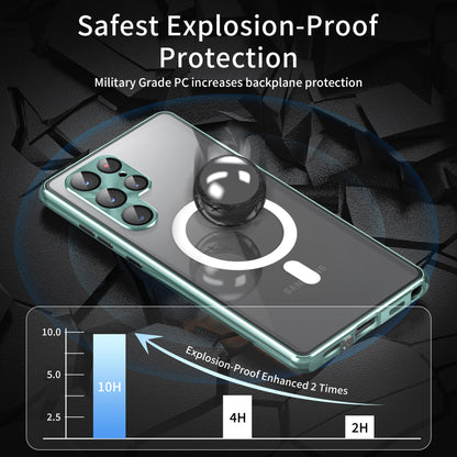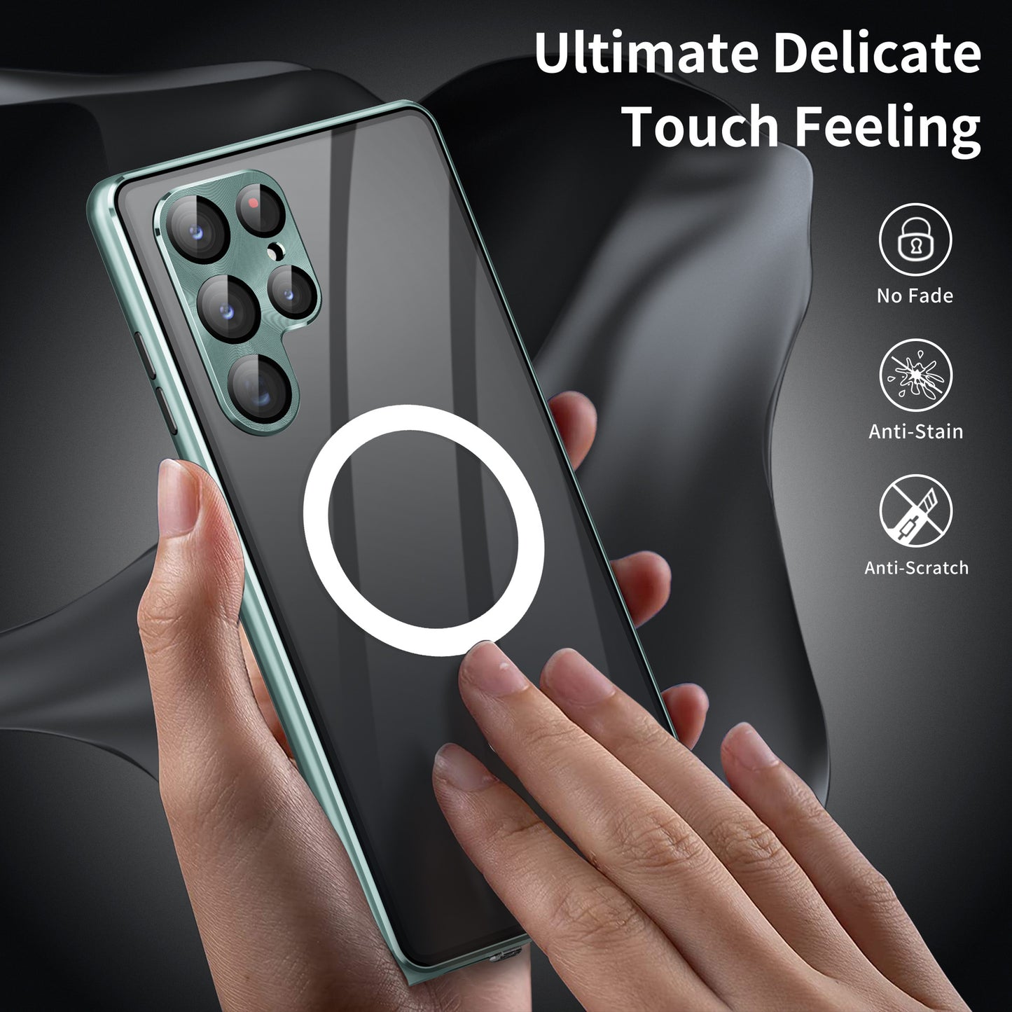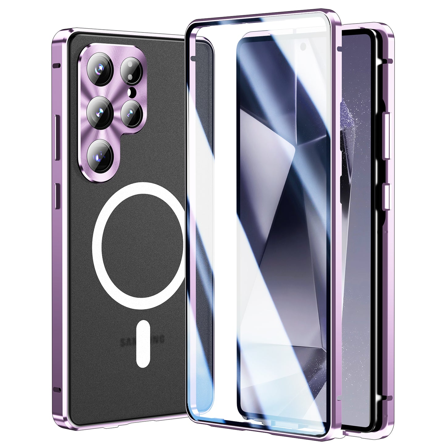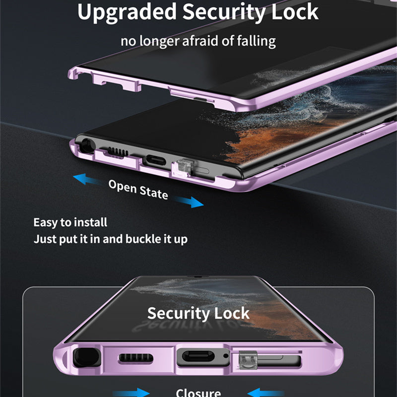 - 360 Degree Full Body Protective Case. Front Tempered Glass Panel + Magnetic Absorption Aluminum Metal Bumper + Magnetic Ring Clear PC Back Panel + Built-in Camera Lens Protector.