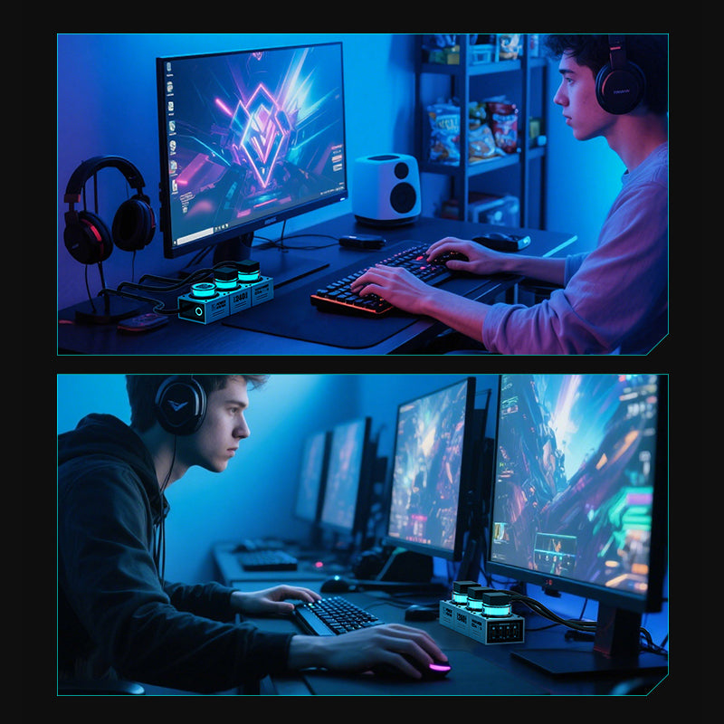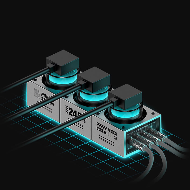 - RGB dynamic, breathing lighting ignites the battle atmosphere with a single tap, syncing with your gaming peripherals! (Instructions: Tap once to switch between different ambient lighting effects; press and hold for about 3 seconds to turn off the ambient lighting; press and hold for about 10 seconds to turn off the outlet output and ambient lighting, but not the USB output.)
