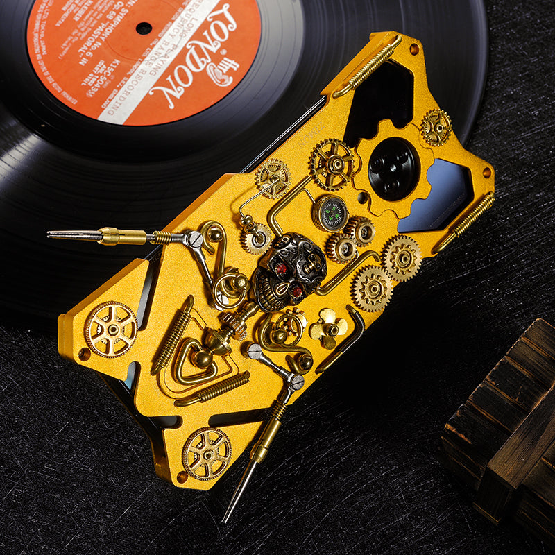 Gear linkage, pipe art, refined copper craft in the industrial era, add steampunk elements such as fan and compass, combined with the hollow structure of the metal frame, construct a dynamic Picasso abstract art painting.