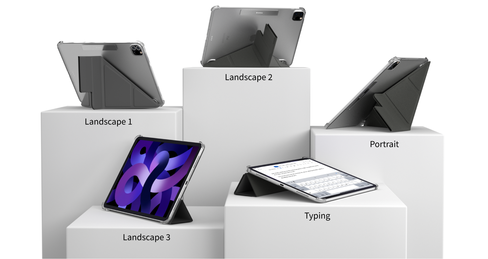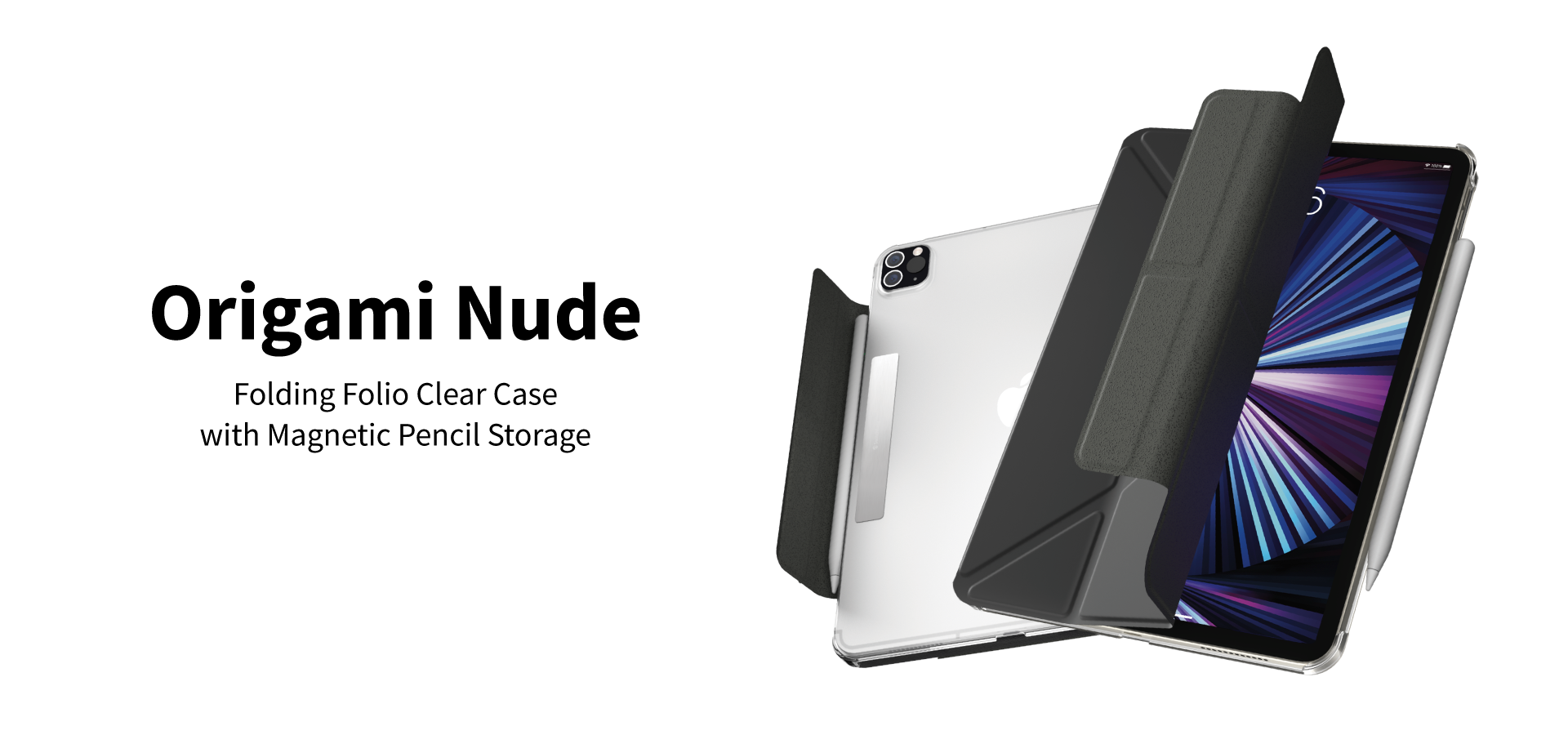 Origami Nude is a flexible-folding folio, providing 4 positions for 4 usage scenarios. Crystal clear hard back casing, showing the original beauty of iPad. Auto wake/sleep function conserves energy for heavy users. With magnetic flap for stylus storage and protection, making it easy to carry and charge Apple Pencil everywhere.