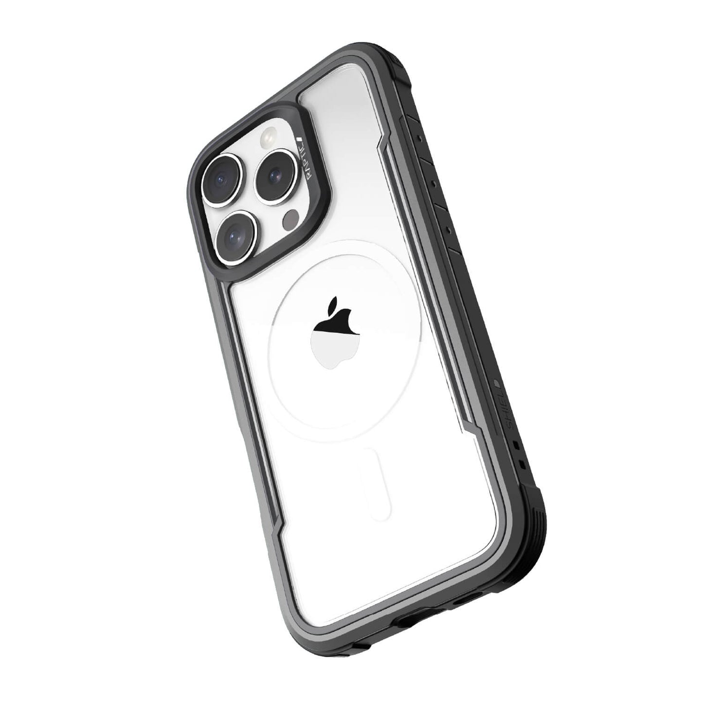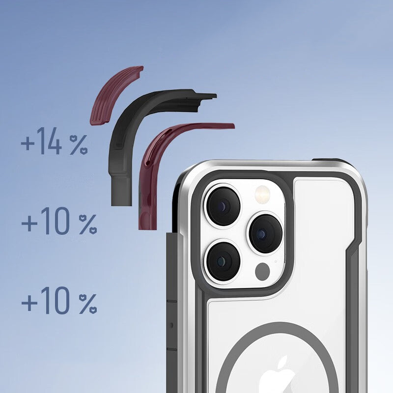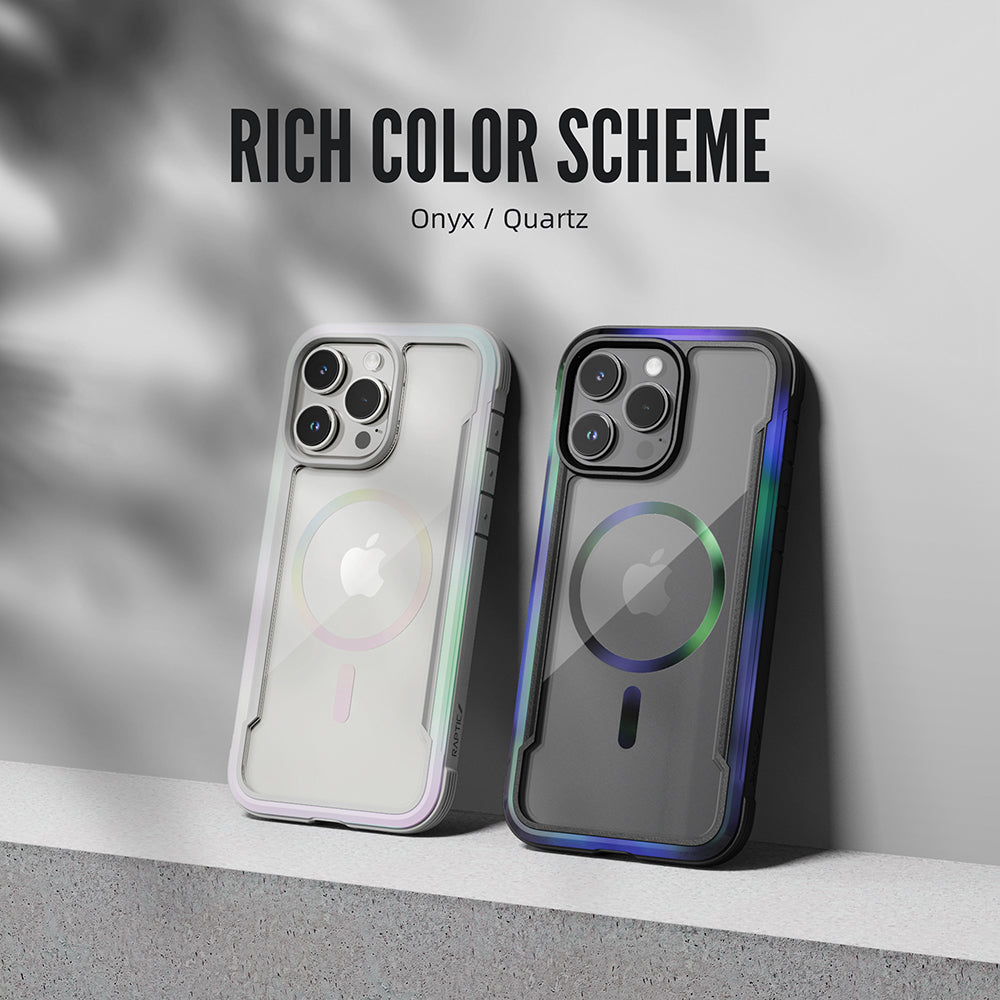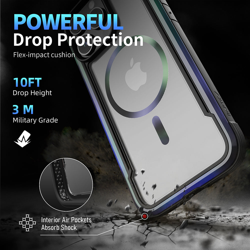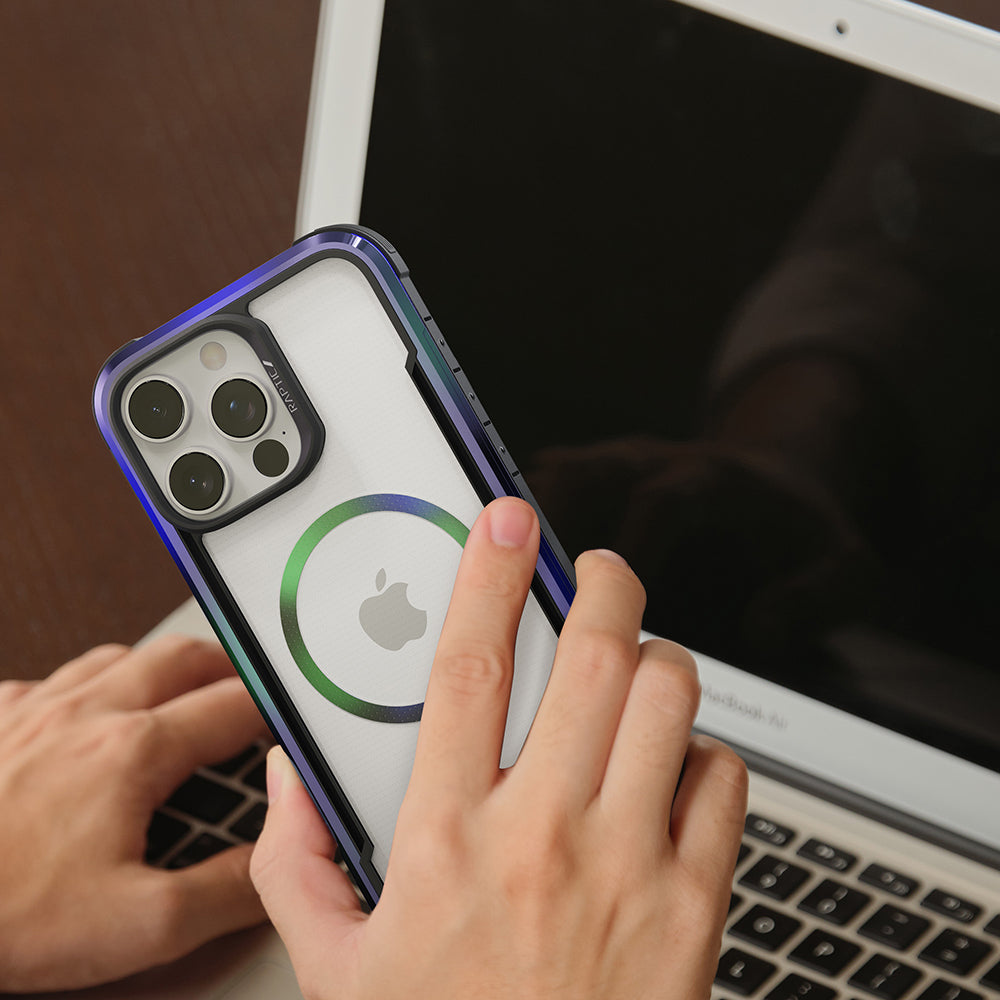 The Raptic Shield Pro Magnet case uses a ring of magnets creating the perfect alignment for fast wireless charging and secure connection. Using a combination of hard polycarbonate, DropShield Polymer and anodized aluminum, our Raptic Shield Pro Magnet case is the best protection you could ever want for your iPhone. We use machined metal to give your case a solid foundation that offers military-grade drop protection from up to 13 feet on concrete and a clear back to show off your iPhone. Inside you’ll find soft rubber that acts as shock absorption for falls, and insulated protection from the metal frame. Compatible with MagSafe Charger at the full 15W charging rate.